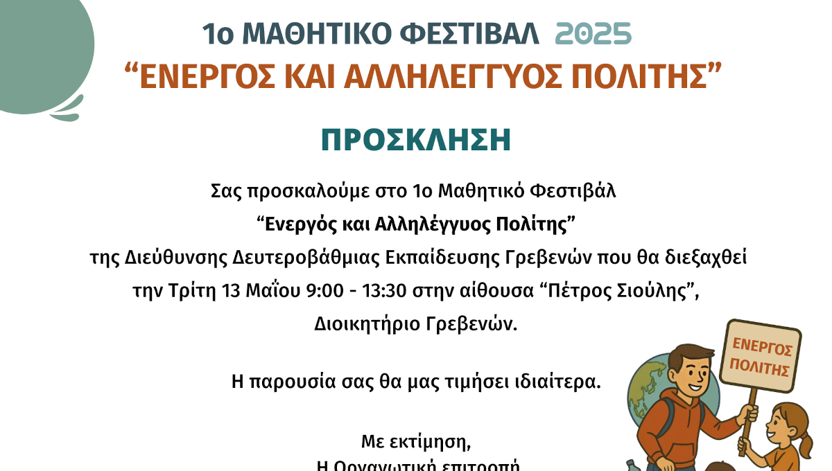 Ο Πόλος Εκπαιδευτικής Καινοτομίας ΤΠΕ Γρεβενών συμμετείχε υποστηρικτικά στο 1ο Μαθητικό Φεστιβάλ «Ενεργός και Αλληλέγγυος Πολίτης», που διοργάνωσε η Δευτεροβάθμια Εκπαίδευση Γρεβενών και το οποίο πραγματοποιήθηκε την Τρίτη 13 Μαΐου 2025, στην αίθουσα «Πέτρος Σιούλης» του Διοικητηρίου Γρεβενών.