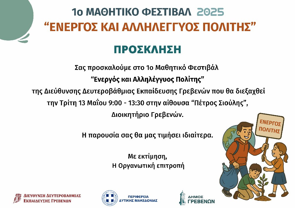 Ο Πόλος Εκπαιδευτικής Καινοτομίας ΤΠΕ Γρεβενών συμμετείχε υποστηρικτικά στο 1ο Μαθητικό Φεστιβάλ «Ενεργός και Αλληλέγγυος Πολίτης», που διοργάνωσε η Δευτεροβάθμια Εκπαίδευση Γρεβενών και το οποίο πραγματοποιήθηκε την Τρίτη 13 Μαΐου 2025, στην αίθουσα «Πέτρος Σιούλης» του Διοικητηρίου Γρεβενών.