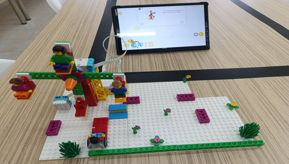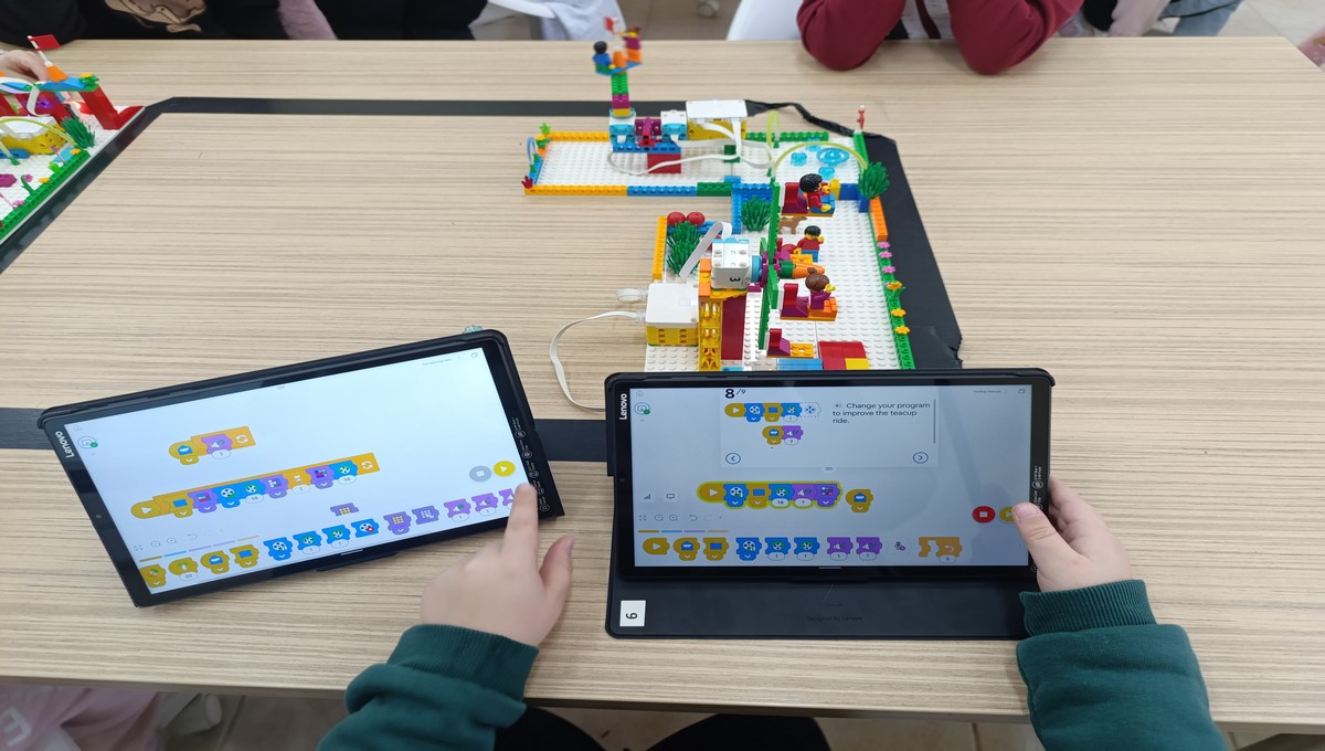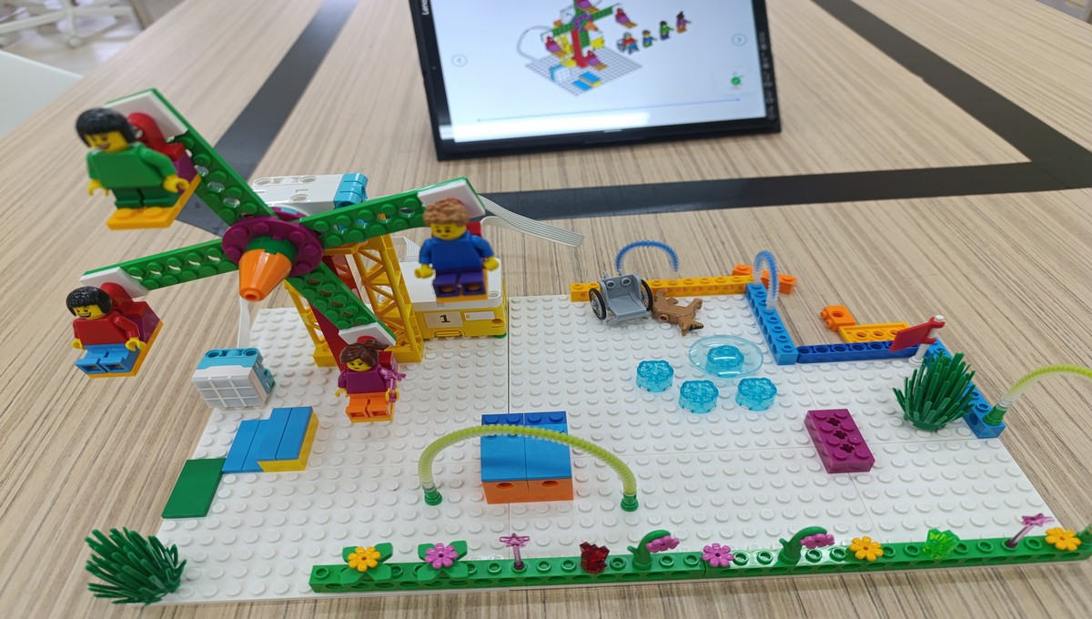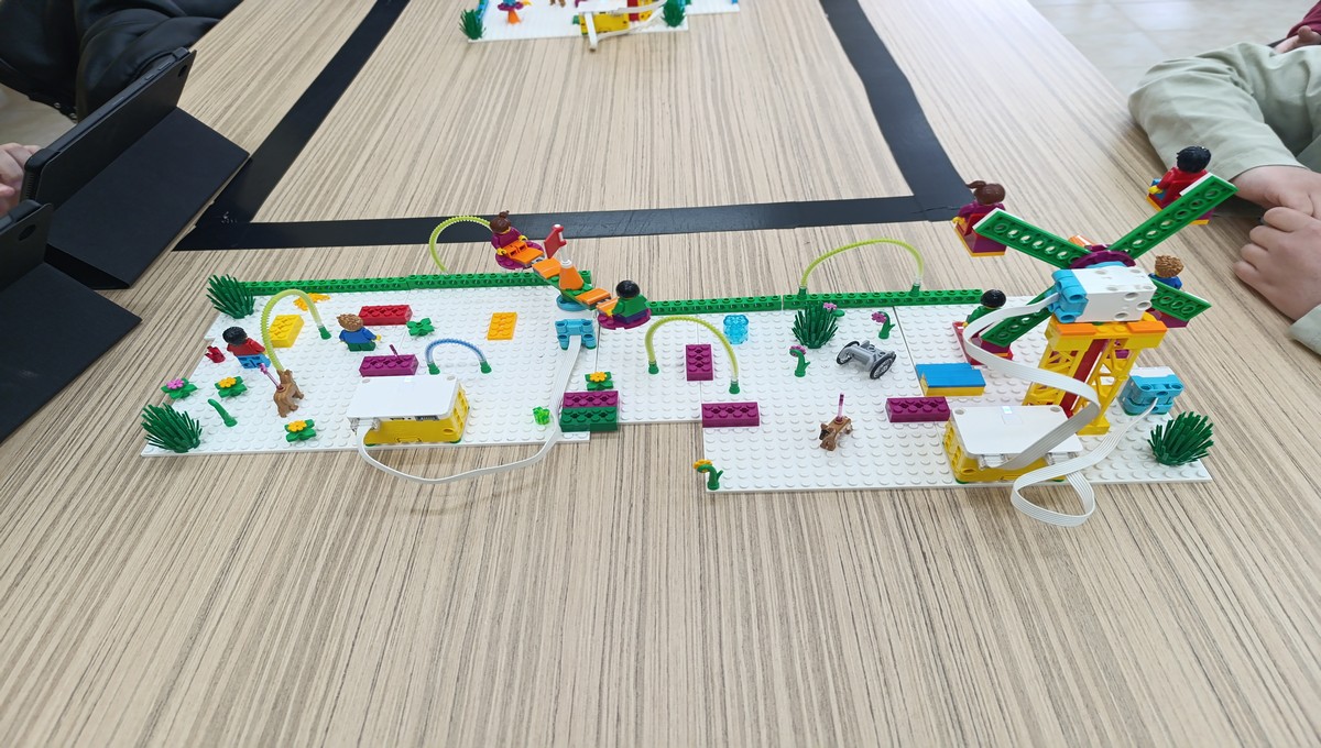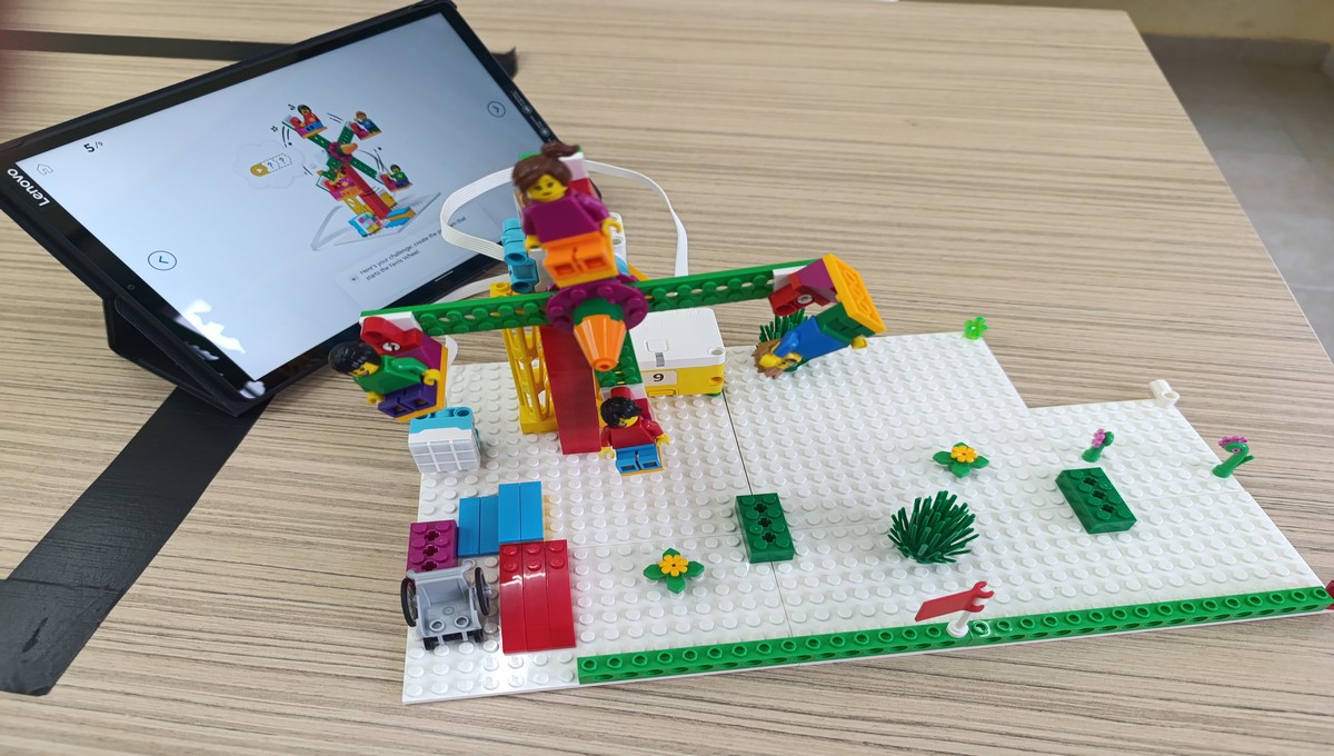 Αξιοποιώντας το εκπαιδευτικό πακέτο Lego Spike Essential, οι μικροί μαθητές μεταμορφώθηκαν σε επίδοξους μηχανικούς, δουλεύοντας ομαδικά για να κατασκευάσουν και να προγραμματίσουν τις δικές τους περιστρεφόμενες κούνιες και παιχνίδια αναψυχής.