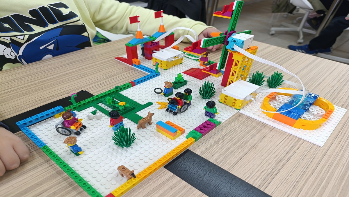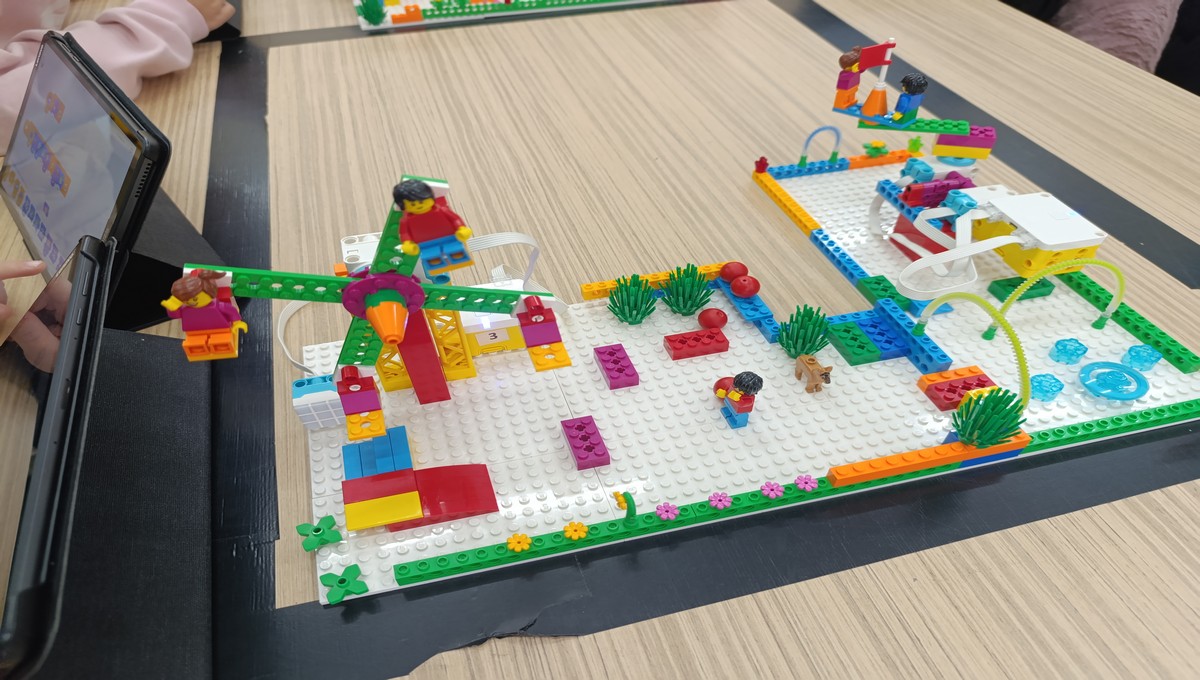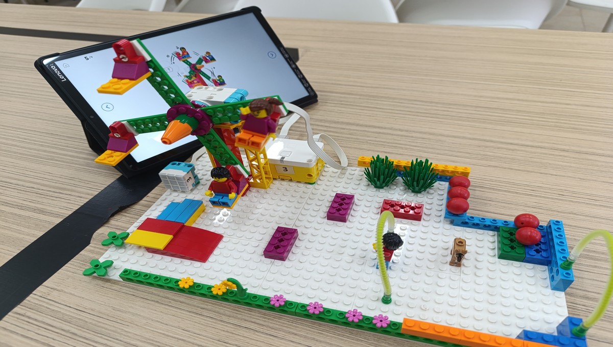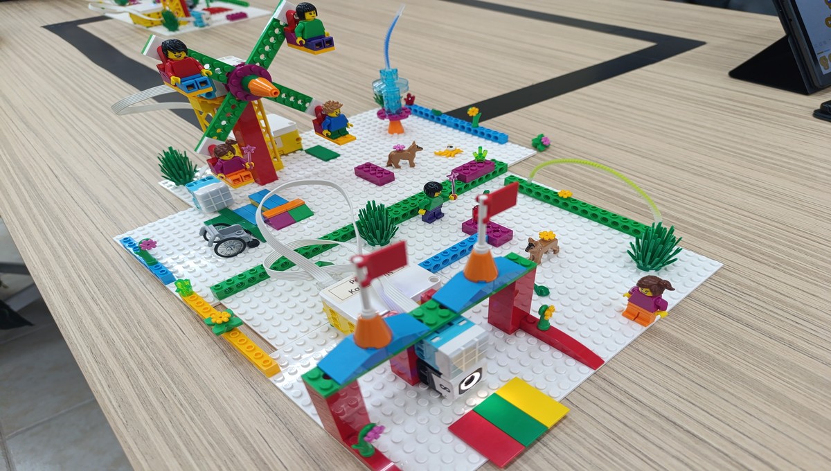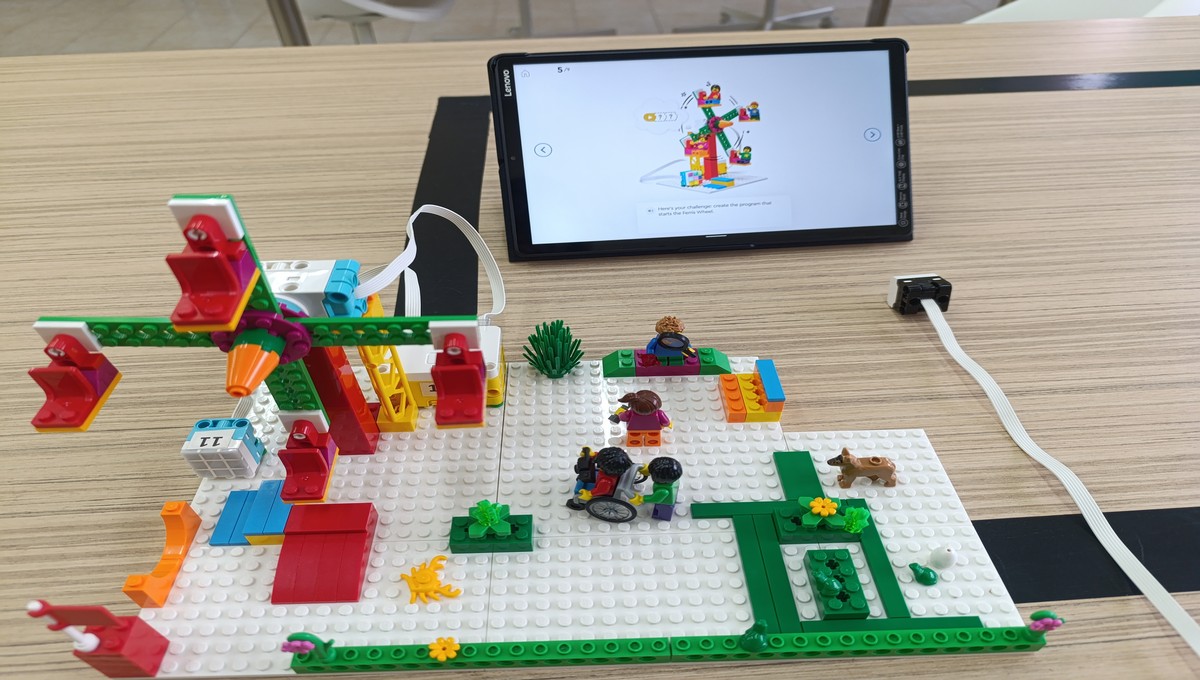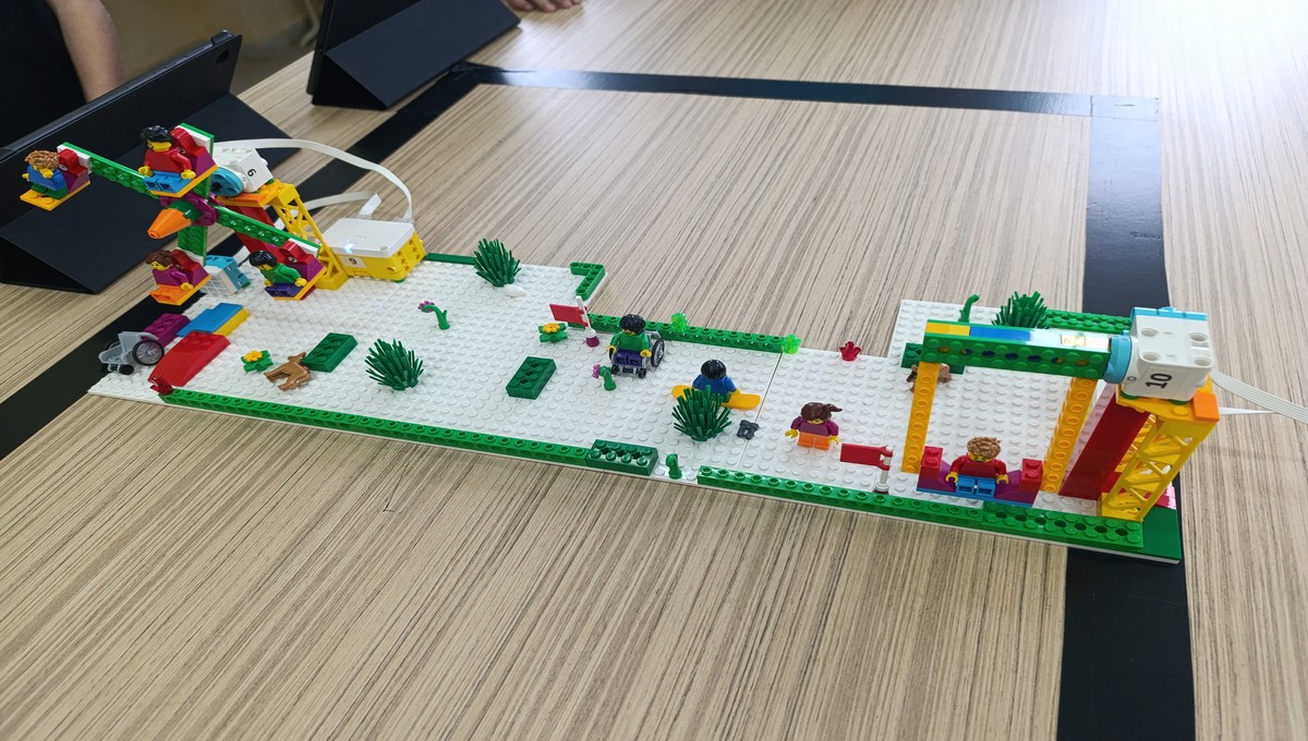 Αξιοποιώντας το εκπαιδευτικό πακέτο Lego Spike Essential, οι μικροί μαθητές μεταμορφώθηκαν σε επίδοξους μηχανικούς, δουλεύοντας ομαδικά για να κατασκευάσουν και να προγραμματίσουν τις δικές τους περιστρεφόμενες κούνιες και παιχνίδια αναψυχής.
